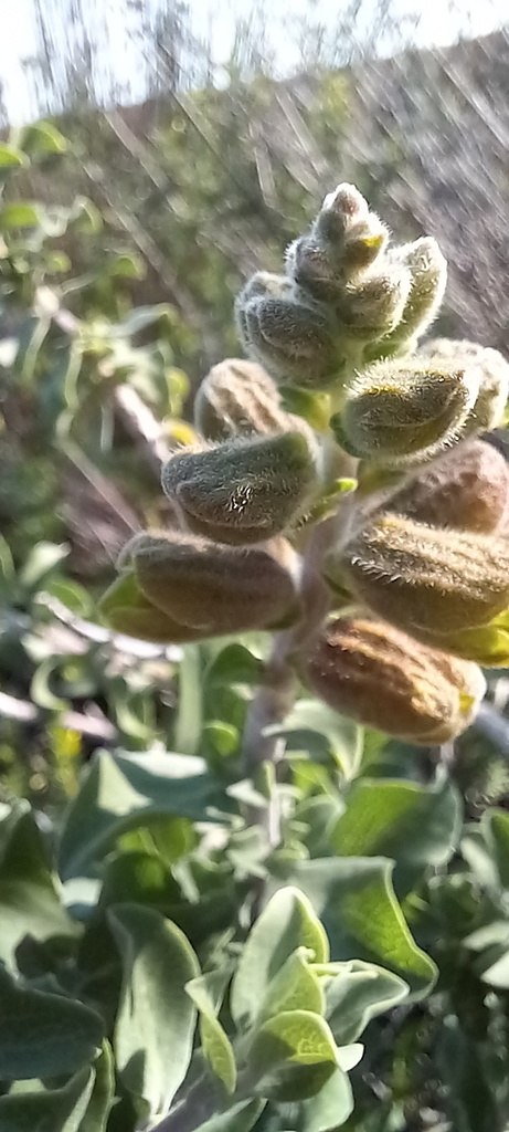 Salvia africana-lutea (beach salvia, dune salvia, golden salvia, bruin- of sandsalie, geelblomsalie) is a shrubby evergreen perennial native to coastal sand dunes and hills on the coast of the Cape Province in South Africa. It has numerous woody stems growing to more than 1 m in height and width, with sparse grey-green leaves. The flowers start out as a bright yellow, turning into a rusty color, with the dark rusty-colored calyx persisting long after fruiting begins.