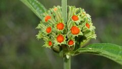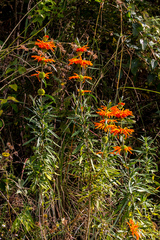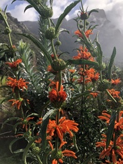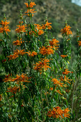 The medium-dark green long leaves are aromatic when crushed. The plant has tubular orange flowers in tiered whorls, typical to the mint family, that encircle the square stems. They rise above the foliage mass during the summer season, with flowering continuing into winter in warmer climates.