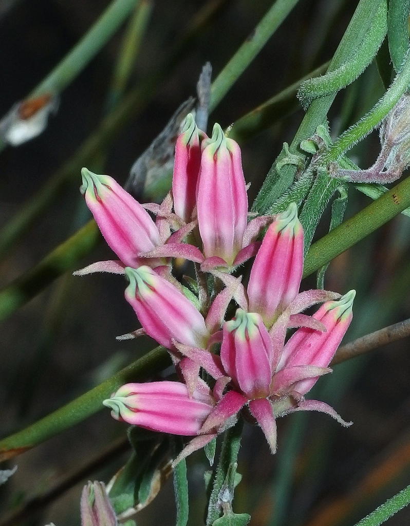 The distinctive pink flowers have sepals that spread outwards, and a central, green pointed column. The flowers appear in winter and spring.