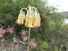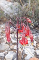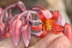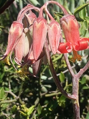 Cotyledon orbiculata is an extremely variable species that grows to approximately 1.3 m in height. It has gray-green leaves that can be up to 13 by 7 cm with a white powdery substance on them that helps reflect sunlight and conserve water. The shape of the leaves was thought to have a resemblance to a pig's ear, thus the common name. The bell-shaped flowers are small, usually less than 3 cm in length, and droop from the top of a 60 cm tall stalk. The flowers are usually orange-red but yellow varieties also exist.