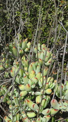 The brightly coloured flowers attract bees and birds, which feed on the nectar of the plant. The silver-grey leaves of some forms owe much of their attractive colouring to a powdery white coating which may assist in reflecting much of the sun's heat to prevent excessive water loss from the thick succulent leaves.