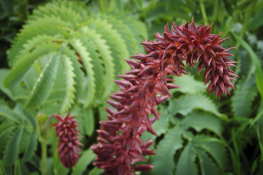 As seen in the picture, this plant has distinctively shaped large bright green leaves and elongated post of red flowers. The leaves give off a nutty repulsive smell.