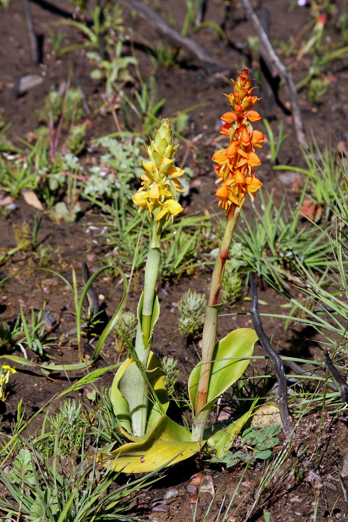 Satyrium coriifolium is brightly coloured, with yellow or orange-red flowers. It is a perennial plant. It flowers from August to November. The flowers are non-resupinate.