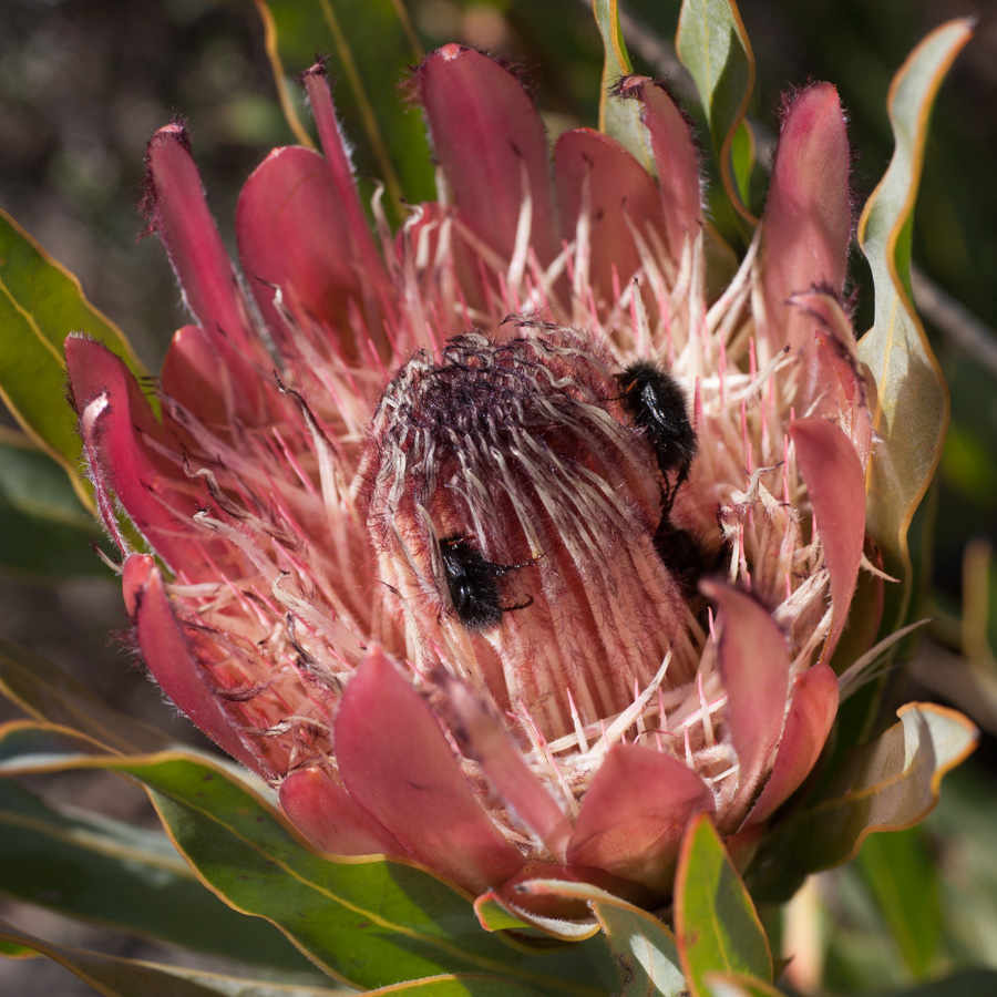 This is a ground hugging protea shrub with oblong olive green leaves and cream to red coloured flowers.
