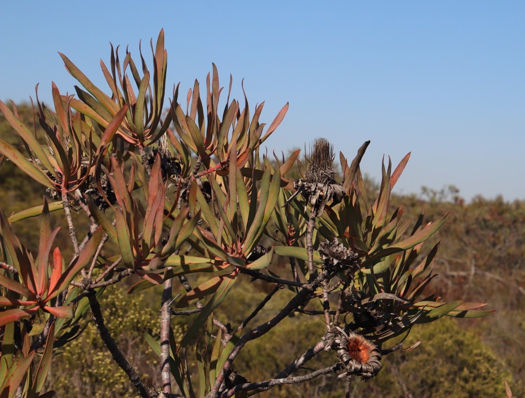 This is a ground hugging protea shrub with oblong olive green leaves and cream to red coloured flowers.