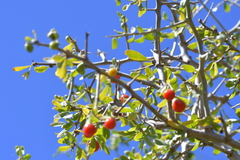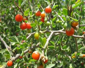 African boxthorn is a large shrub which grows up to 5 metres (16 ft) high and is covered in spines. The spines are of randomly varying lengths along the branch and, unlike most other species of Lycium (except for Lycium amoenum), they take the form of stout "peg-thorns".