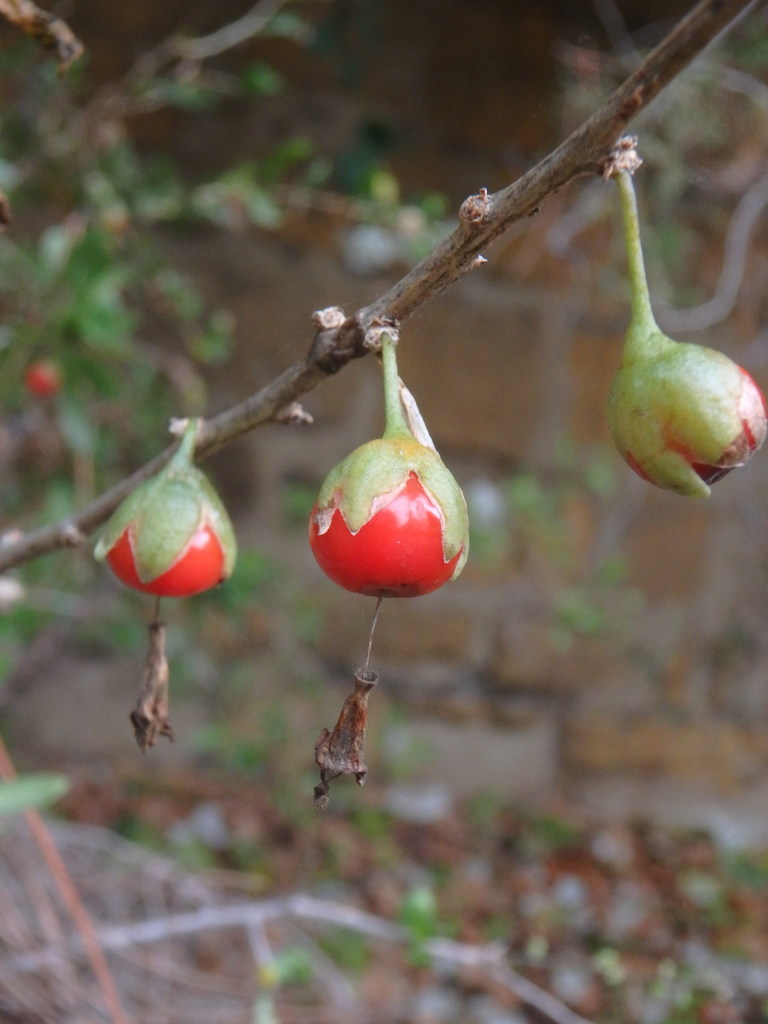 The solitary flowers emerge from the leaf axils. The corolla is funnel-shaped with large, reflexed, pale purple lobes (petals). The calyx is tubular and encloses most of the corolla (a character shared with Lycium pumilum). This latter character, the calyx that is at least two thirds of the length of the corolla, serves to distinguish this species from many of its relatives.