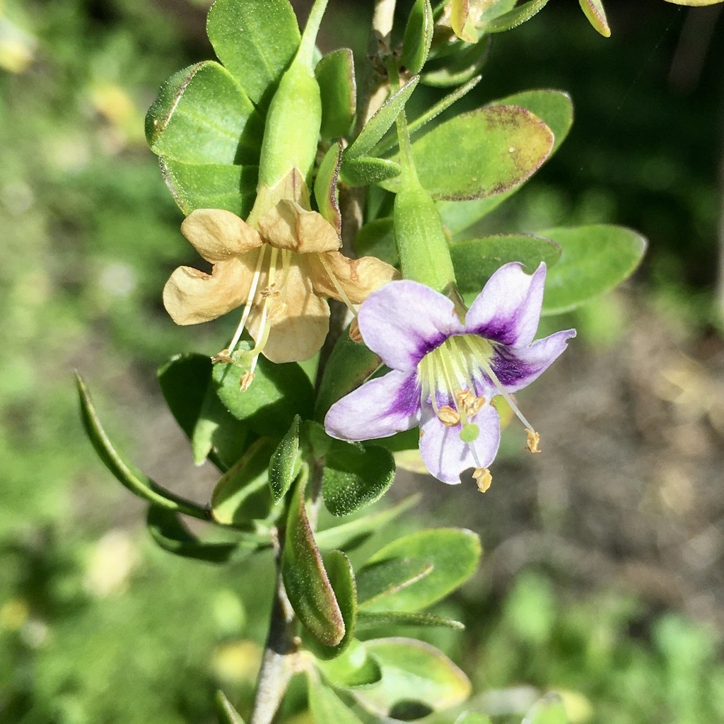 The solitary flowers emerge from the leaf axils. The corolla is funnel-shaped with large, reflexed, pale purple lobes (petals). The calyx is tubular and encloses most of the corolla (a character shared with Lycium pumilum). This latter character, the calyx that is at least two thirds of the length of the corolla, serves to distinguish this species from many of its relatives.