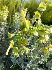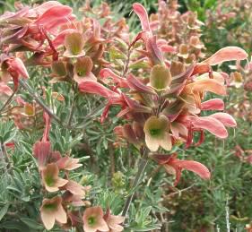 This upright shrub has light green leaves and dull red, crimson or grey-blue flower, with a shape is typical of the related wild sages.