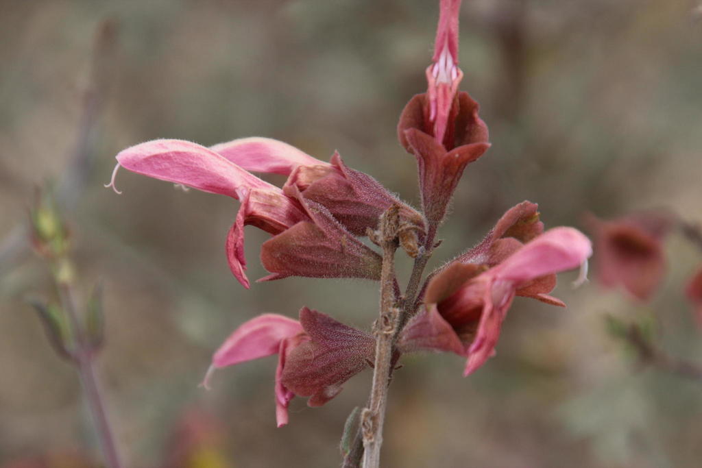 This upright shrub has light green leaves and dull red, crimson or grey-blue flower, with a shape is typical of the related wild sages.