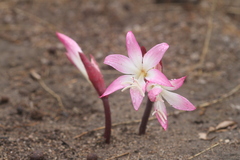 Perennial bulbous geophyte with one to two erect solid stems which appear in late summer. The inflorescence bears 2–12 showy fragrant funnel-shaped flowers on a 'naked' (leafless) stem, which gives it the common name of naked-lady-lily. The pink flowers which may be up to 10cm in length, appear in the autumn before the leaves (hysteranthy) which are narrow and strap shaped.