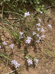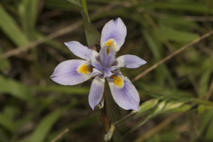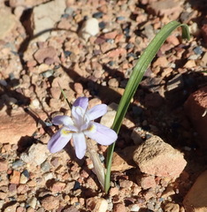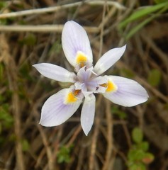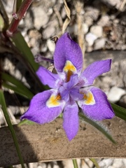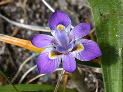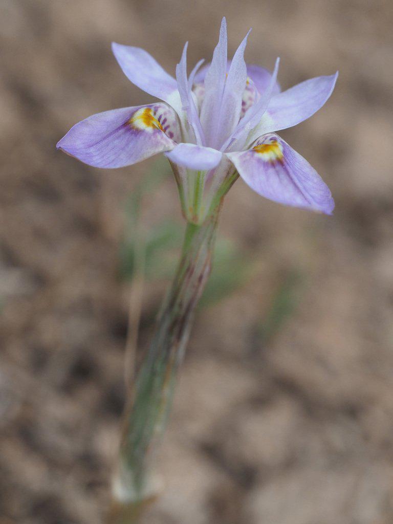 Can be up to 12cm tall. One or two linear, channelled leaves that trail above; flowers are enclosed in translucent spathes and are small, pale mauve with orange and white nectar guides. The outer tepals are 12-18mm long.