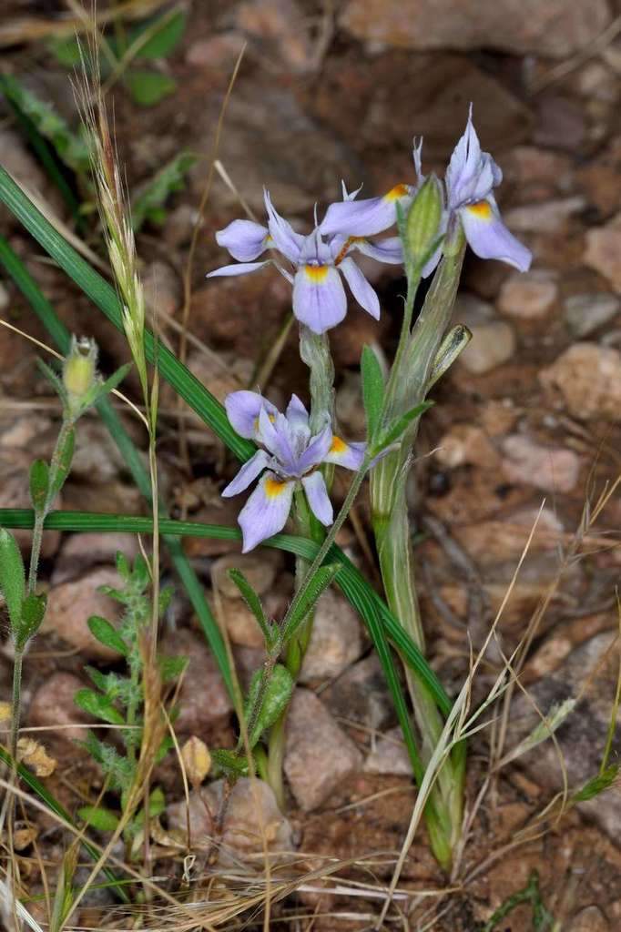 Can be up to 12cm tall. One or two linear, channelled leaves that trail above; flowers are enclosed in translucent spathes and are small, pale mauve with orange and white nectar guides. The outer tepals are 12-18mm long.