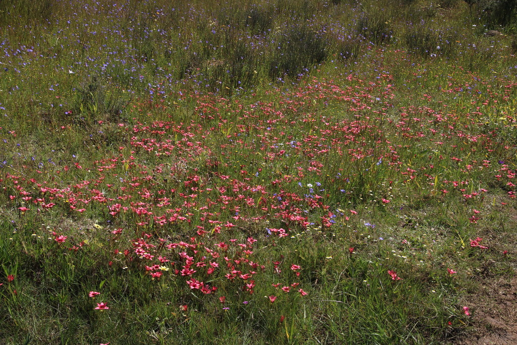 Unscented flowers are present in August and September. They are usually pink or red in colour and frequently have darker markings around the yellow cup in the center. The tepals range between 15 and 35 mm (0.59 and 1.38 in) in length. The coppery orange coloured population found growing on mountains between Clanwilliam and Hermanus lack the darker markings around the center. These flowers may resemble Romulea triflora.