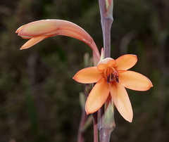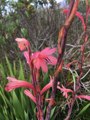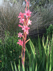 Watsonia meriana is a species of flowering plant in the family Iridaceae known by the common name bulbil bugle-lily. It is one of several Watsonia species known as wild watsonia. It is native to the Cape Provinces of South Africa, but it is well known as an ornamental plant grown in gardens for its showy spikes of flowers, and is an invasive species in areas where it has escaped cultivation.