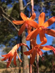 It is a perennial herb growing from a fibrous-coated corm and growing to a maximum height well over one meter when in flower, sometimes reaching two meters. Each corm produces three or four erect, lance-shaped leaves that measure up to 60 centimeters long by 6 wide. They have thickened midribs and margins. The inflorescence is an open spike of 8 to 25 flowers which may be in shades of orange to reddish or purplish. The flower is up to 8 centimeters long, with a long, tubular throat and spreading tepals.