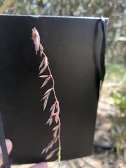 The inflorescence is a narrow to wide open array of spikelets light in color when new and becoming darker and tinted purple to reddish with age.