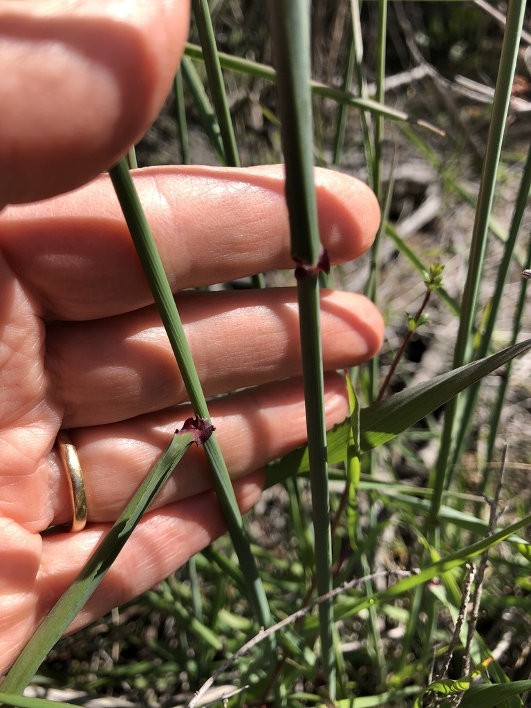 The inflorescence is a narrow to wide open array of spikelets light in color when new and becoming darker and tinted purple to reddish with age.