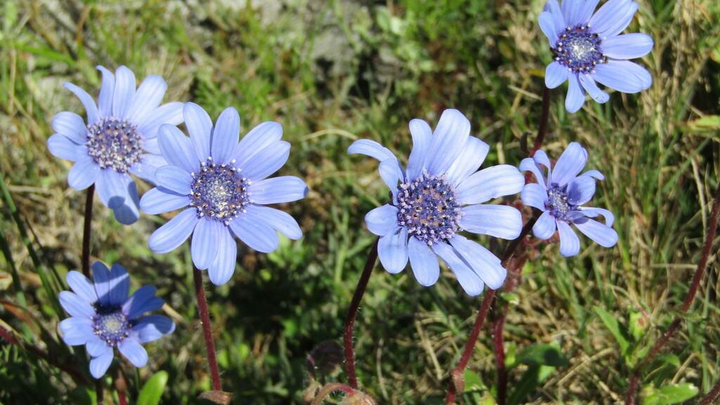 The blue flowerheads, consisting of blue ray and disc florets, are borne singly on long peduncles during spring (August-October). The 'seeds' (cypselas) are small, 4.5 x 2 mm, elliptic or obovate, yellowish brown and hairy. They are topped with a tuft of white hairs (pappus hairs) which helps with wind dispersal.