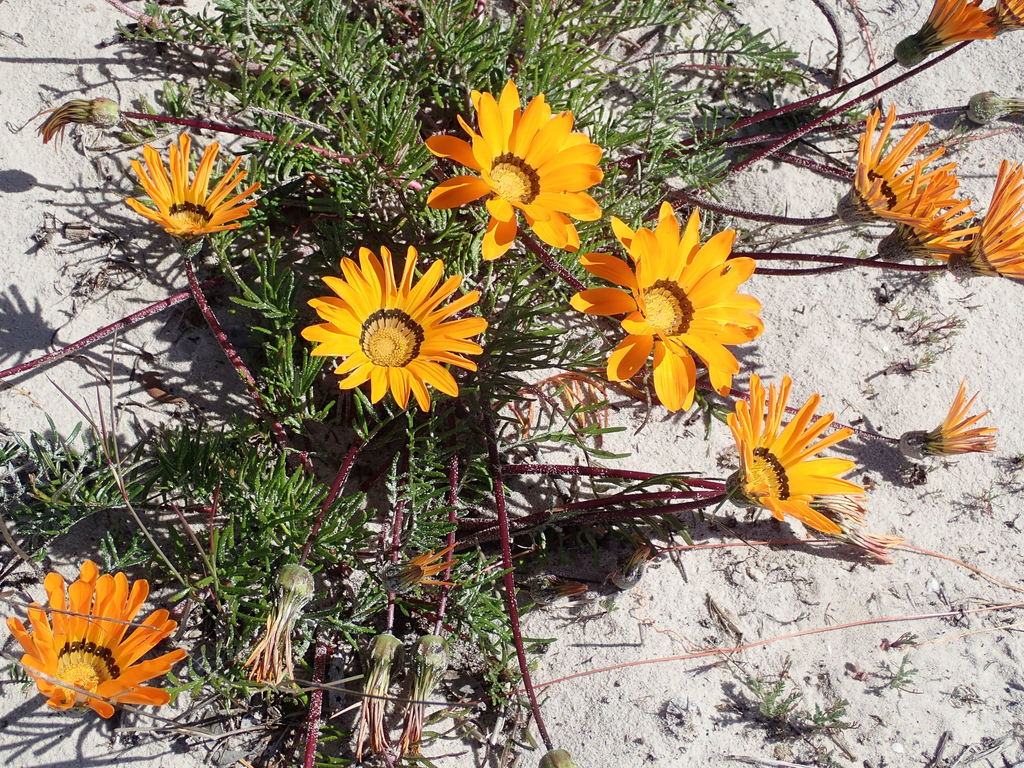 A bright orange daisy with a dark brown almost black tip at the base of each petal making a ring at the centre of the looking plant. Leaves are bright green, erect and narrow.