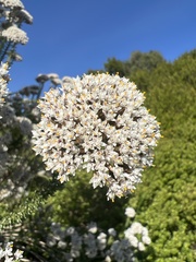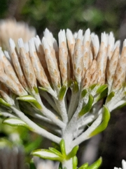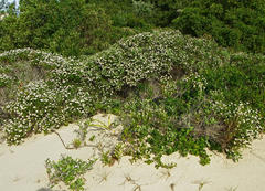 A grey, rounded, twiggy honey-scented shrub of 2-4m height that is very useful as a pioneer and soil stabiliser. It comes up very fast after a fire creating a nursery environment for other plants. Along with other asteraceae it adds mycorrhizae to the soil.