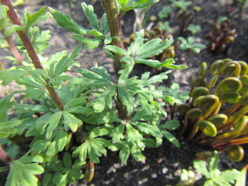 This geophyte grows to be up to 12–30 cm (4.7–11.8 in) tall. The leaves are mostly basal and grade into bracts up the stem. The deeply dissected leaves have a palmatisect or palmatifid shape and are paler on the underside.