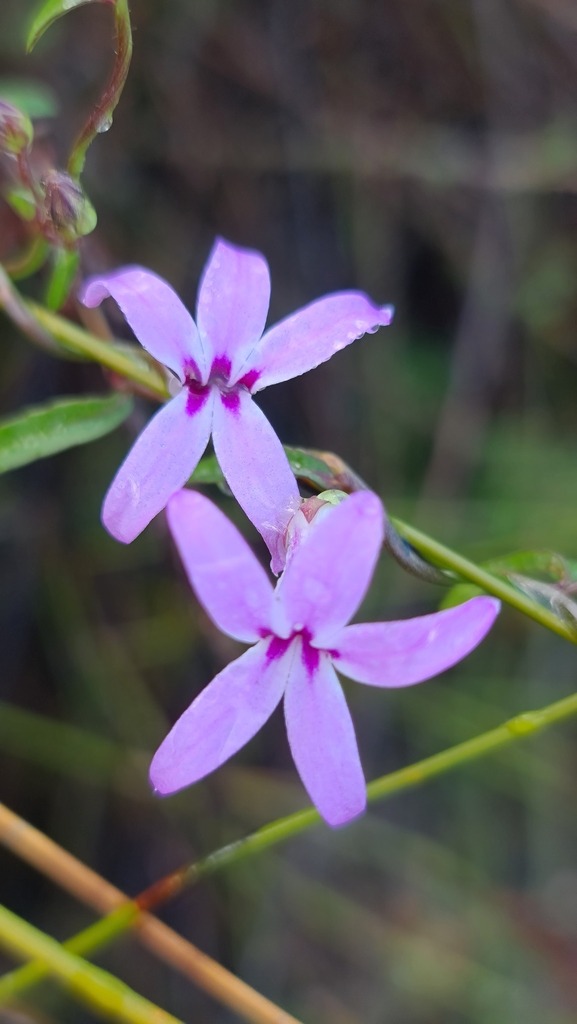Cyphia volubilis is a species of flowering plant in the genus Cyphia, endemic to the Western Cape. It is a type of Fynbos climbing plant that uses a host to get its own flowers above ground. It has a bilabiate corolla; with 3 lobes on top and 2 at the bottom.