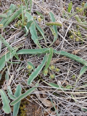 Euphorbia tuberosa is a spineless, deciduous, dwarf succulent geophyte (bulbous plant), up to 50 mm tall, with a tuberous underground stem that re-sprouts after fire. A cluster of wavy grey-green leaves are produced at ground level, forming a rosette and are up to 50 mm long and 10 mm wide.