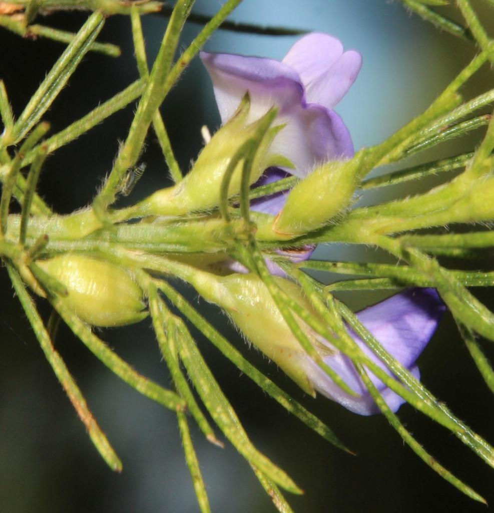 The leaves are compound and are composed of several pairs of leaflets and a terminal one. The leaflets are 50 mm long and 3 mm wide and are aromatic when crushed. The pea-flowers are borne at the ends of the branches or in the axils of the upper leaves. Although the flowers are seldom very showy, they are delicate and charming on the slender branches. White-eyes are often seen probing for insects attracted to the flowers.