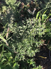 Pelargonium triste is a geophytic species that has a large, subterranean tuber with tuberous roots with a rather cracked, woody bark. The prostrate leaves are produced directly from ground level with minimal stem growth; they are hairy, divided, and softly feathered, resembling the leaves of a carrot plant.
