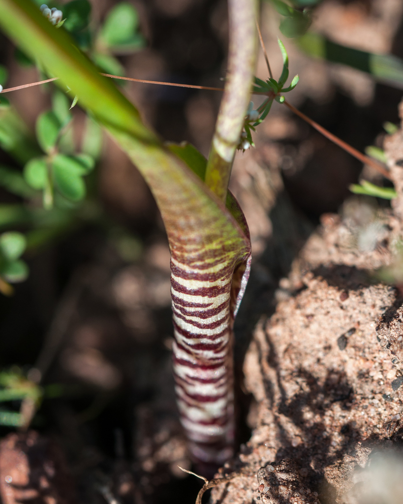This bulbous geophyte grows 8–35 cm (3.1–13.8 in) tall. It has one linear leaf, the lower part of which is banded with green and maroon stripes. It is 8–32 cm (3.1–12.6 in) long and clasps the stem at the base. The tuber contains a multi-layered tunic. The outer layers are dark brown and spongy while the inner layers are a translucent white colour.