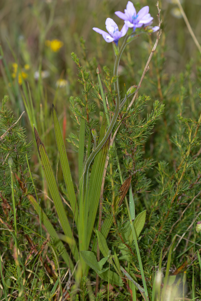 Babiana fragrans is a deciduous, cormous geophyte, with an erect habit and branched stems, 70-200 mm tall. It has hairy, pleated, dagger-shaped leaves that sprout from the corm in mid to late winter. It has strongly sweet-scented, long-lasting, zygomorphic, violet to pale blue flowers, that occur on a branched inflorescence in winter to spring (July-September).