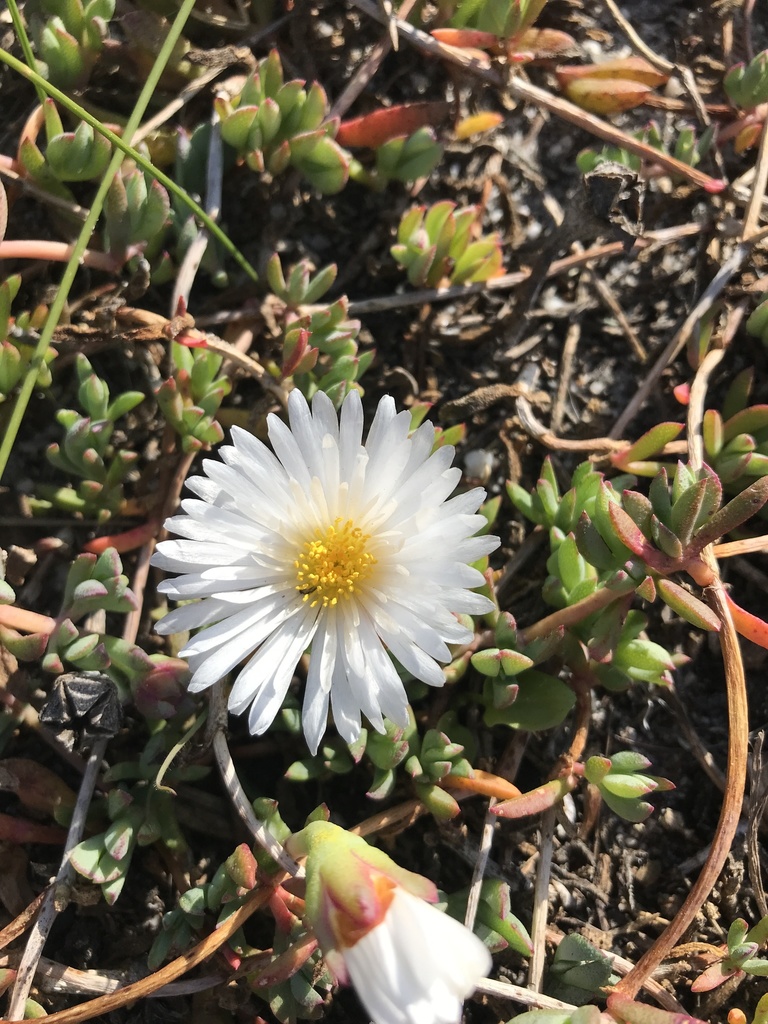 A ground creeping succulent with a bright yellow or white flower (?) found in full sun in acid sandy soils in the flats.