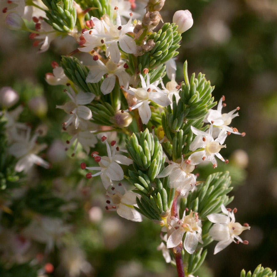 The numerous, thread-like leaves are in feathery tufts of about 10. Individual leaves are small (3-7mm), linear-cylindrical, slightly curved, and slightly broader towards their tips.