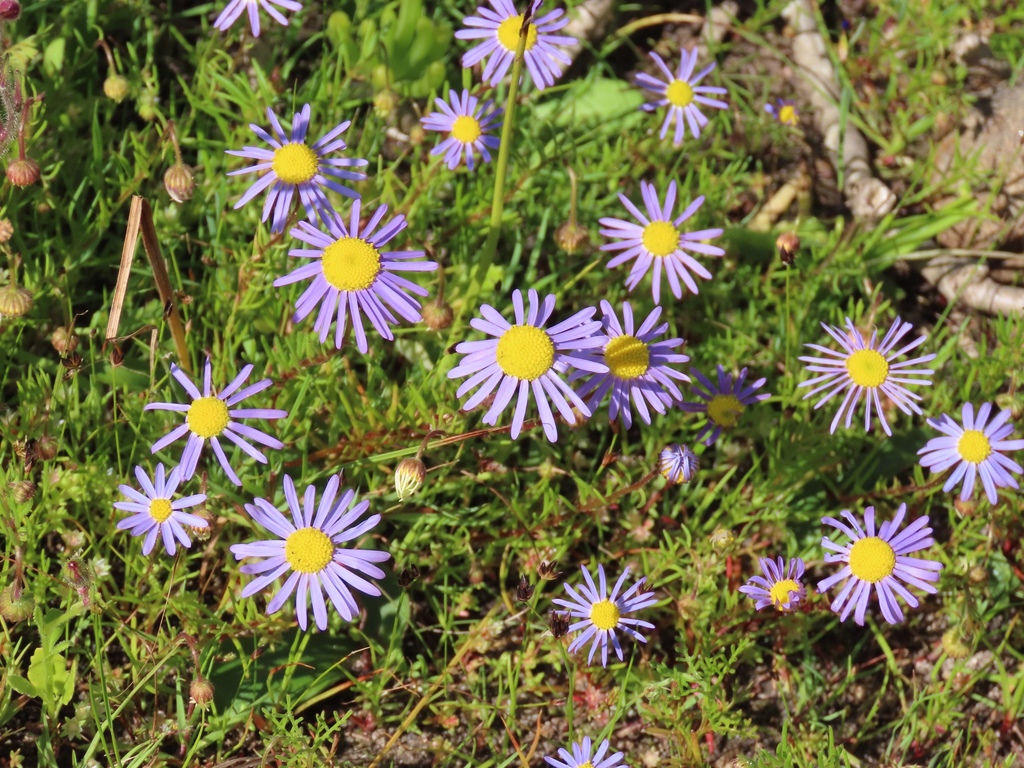 Felicia tenella subsp. pusilla may grow to about 20 cm (8 in) tall. The shoots at the base do not develop roots, the flower heads are medium-sized, larger than in subsp. cotuloides but smaller than in subsp. tenella.
