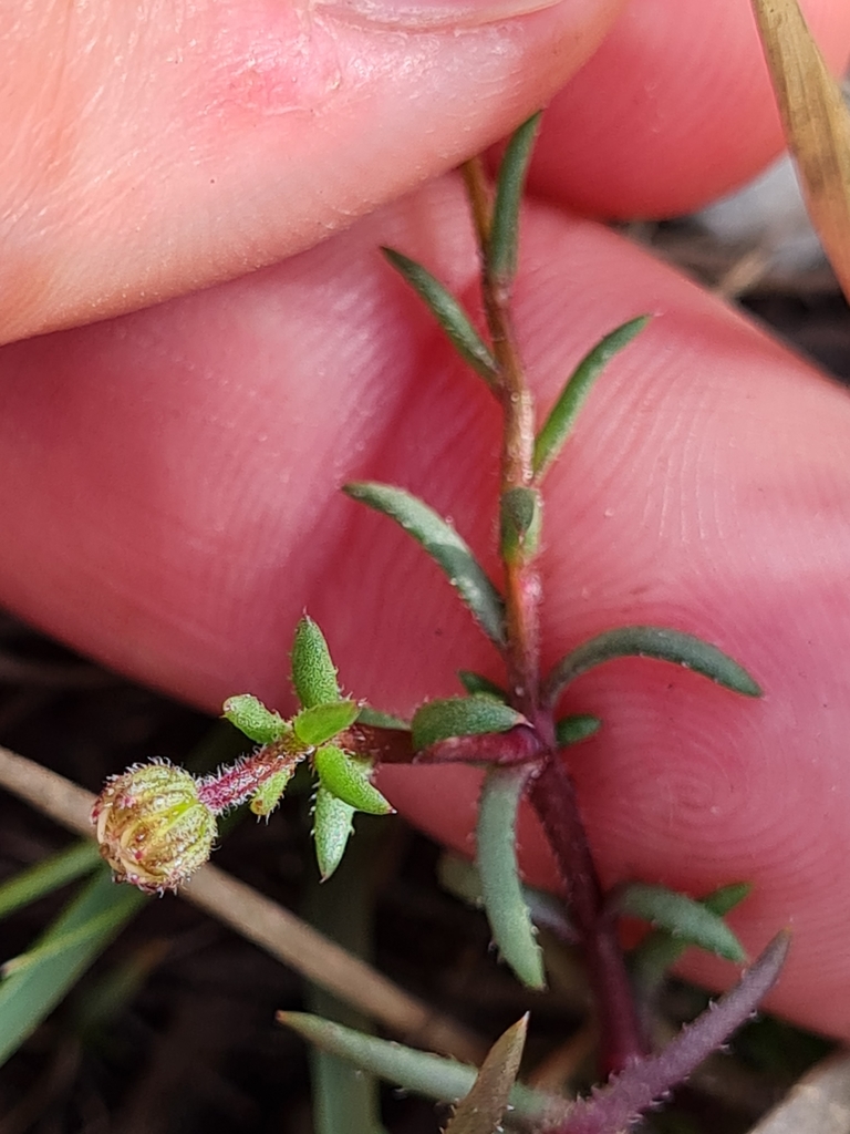 Felicia tenella subsp. cotuloides grows to a height of only 20 cm (7.9 in) and is also higher up richly branching and laxly covered in leaves. The plants are often reddish and densely covered in relatively large glands. The involucre is small, mostly only about 2 mm (0.079 in) across, the style appendages short with 0.3 mm (0.012 in), and the pappus is 11⁄2 mm long, near the base with strong teeth but narrowed near the tip. The involucral bracts are blunt, hardly can a narrowed tip be observed.