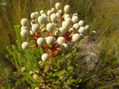 This soft leafed 1.5 m tall shrub has distinctive white ball-shaped flowers with bright red fleshy outgrowth in summer. It occurs in flat damp area near streams, marshes and seepages in sandy loam soil.