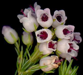 The flowers have an exerted style and are urn- or cup-shaped. They are borne in clusters near the ends of the branches and the colour ranges from pure white to pearly white with a pink blush. Flowering occurs in the summer (October to March).