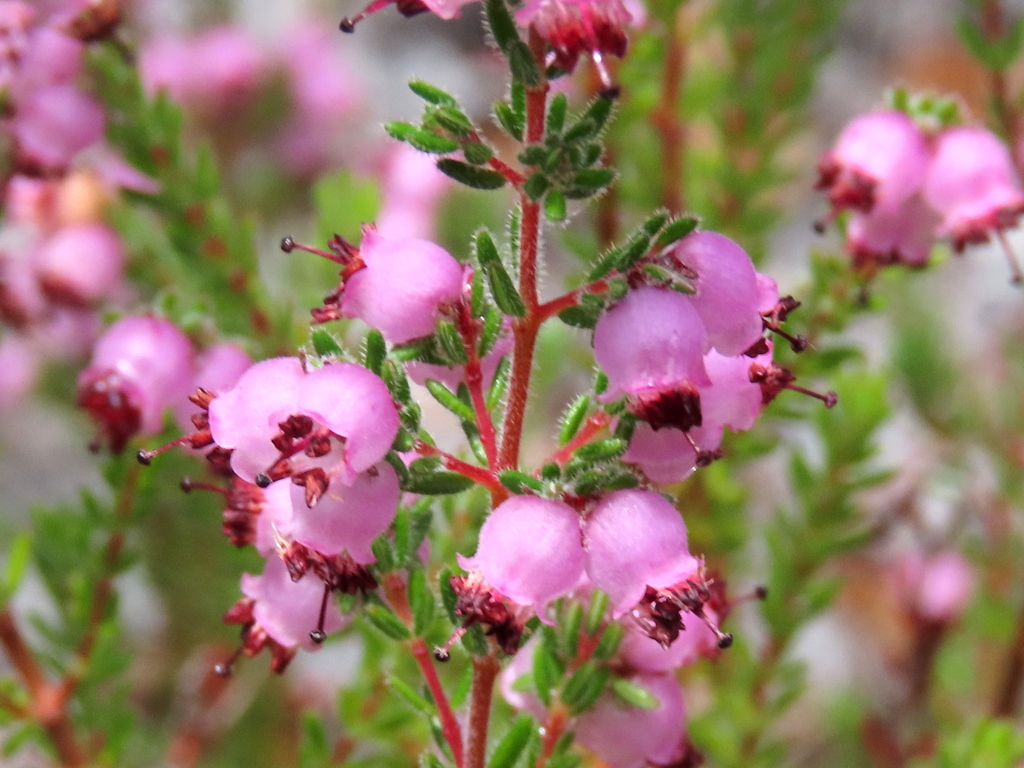 It produces numerous small urn- or cup-shaped, pink flowers, which are clustered at the ends of short branchlets. The flowers are only about 3 mm long and slightly constricted at the mouth from which the anthers protrude. The overall effect is a petite plant that is rather attractive when in flower in early summer (November and December).