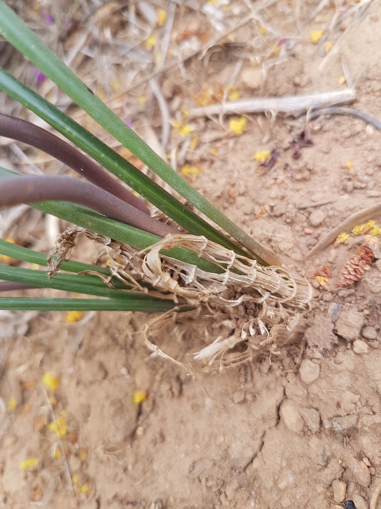 It has a small number of leaves that are long, slender (3-4mm wide), cylindrical, erect, leathery-surfaced quills. The rosette of leaves is basally enclosed in a grey, papery sheath that has distinctive horizontal bars around it.