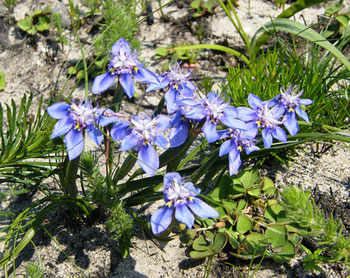 The common name ´Kersblakertjie´, refers to the projecting style crests resembling small candlesticks. Plants of this species are quite small and are easily overlooked and only 6-16cm high. Two leaves are linear, channelled and glossy green. The flowers are deep blue with yellow nectar guides, enclosed in glossy, acute spathes. The tepals are unequal, the outer larger up to 18mm long, both inner and outer tepal limbs spreading; filaments united in the lower two-thirds, anthers appressed to narrow style branches, style crests feathery with red pollen.