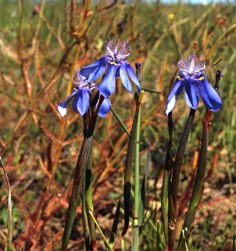 The common name ´Kersblakertjie´, refers to the projecting style crests resembling small candlesticks. Plants of this species are quite small and are easily overlooked and only 6-16cm high. Two leaves are linear, channelled and glossy green. The flowers are deep blue with yellow nectar guides, enclosed in glossy, acute spathes. The tepals are unequal, the outer larger up to 18mm long, both inner and outer tepal limbs spreading; filaments united in the lower two-thirds, anthers appressed to narrow style branches, style crests feathery with red pollen.