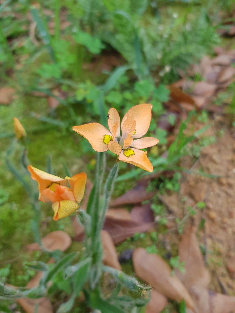 Flowers are butterfly-like in appearance, sweetly scented salmon pink or yellow, with yellow nectar guides on outer tepals, outlined in yellow, green or red. It is 10-20cm tall with a fine woolly pubescence on the stems, leaves and inflorescence spathes. Stems branching mainly from the base. there are 2-4 leaves, linear, up to 7mm wide, occasionally exceeding the inflorescence.