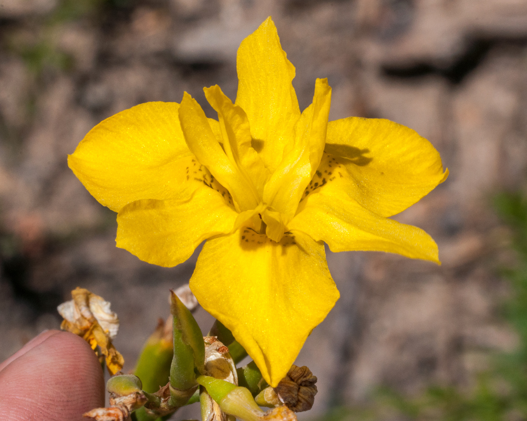 It is a tall plant (up to 1.2 m) with large yellow flowers with darker yellow nectar guides on the outer tepals, enclosed in pale green, acute spathes; red anthers. Known as a shy bloomer, it appears to be a plant that responds to fire, flowers lasting from mid-morning to late afternoon. In Latin ´ramosissimus´ means very branched, referring to the much branched stem of this species.Their very spiny root system deters moles.