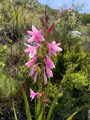 Watsonia borbonica is particularly abundant after fires and is known at some sites to only flower in the first and second years following a fire. Abundant flowering after a fire is followed by the production of masses of seed, which increases the number of successful seedlings. In areas that have burnt, Watsonia borbonica provides a major source of food for nectar-feeding insects and birds, and for the various rodents that eat the seed produced.