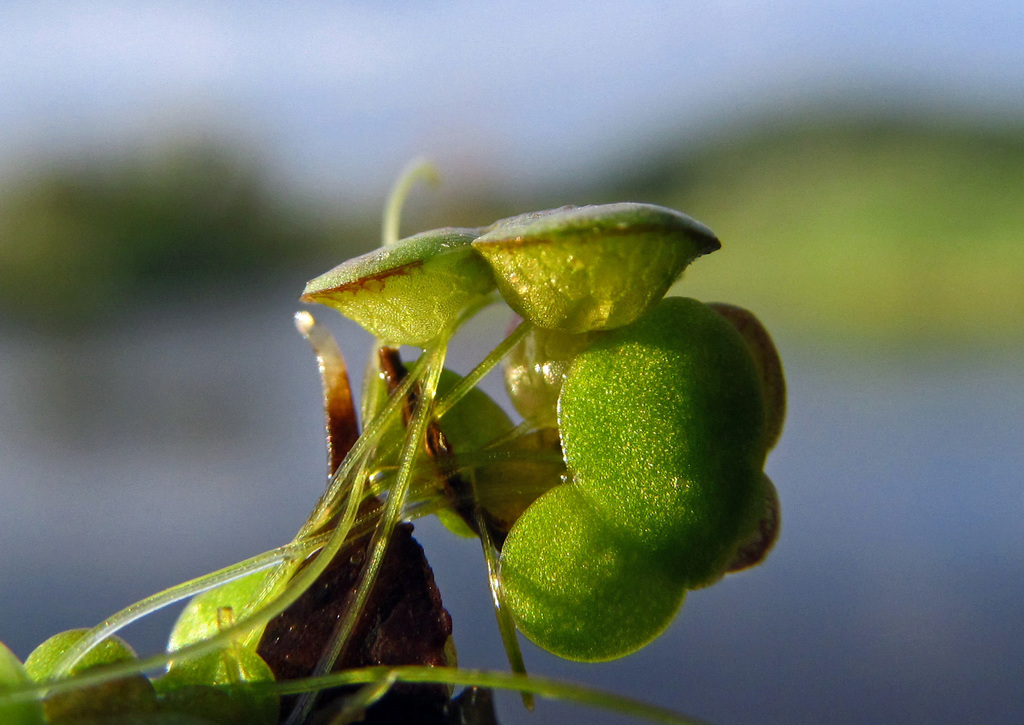 Lemna gibba, the gibbous duckweed, swollen duckweed, or fat duckweed, is a species of Lemna (duckweed). It has a simple plant body, known as a thallus, which floats on the surface of the water and measures 3–5 mm (0.12–0.20 in) in diameter. A single root hangs down into the water. Found in a wide range of still or slow-flowing water bodies, this common duckweed can also grow on mud or damp rocks.
