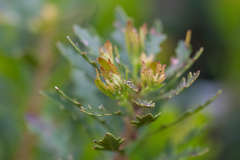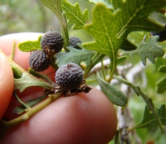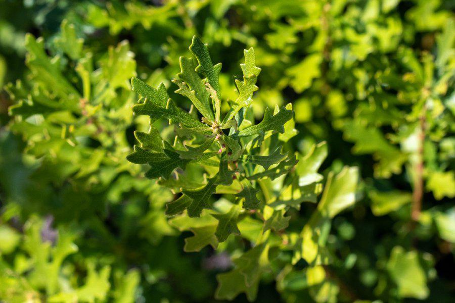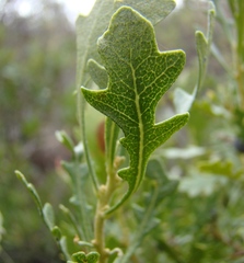 Small shrubby plant with upright stems, flat elongated leaves with irregular oak-like edging, and a yellow flower in winter.