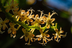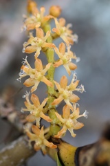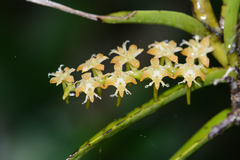 Tridactyle bicaudata is a species of flowering plant in the family Orchidaceae. This species can be found throughout most of Africa, from the Cape Province to Kenya and Ghana. It also can be found in a wide variety of different habitats, which makes it very amenable to cultivation. It has a monopodial growth habit, and can typically be found growing in clumps on rocks or on low lying tree branches. The flowers are canary yellow, 2 cm wide, and have a lip lobed into three sections. Two of the outlying lobes are fimbriated. Usually 8-16 flowers are born on an inflorescence, with multiple racemes possible resulting in a flower count in the thousands. The flowers form two rows on the single inflorescence. The species contains one subspecies, namely Tridactyle bicaudata subsp. rupestris.