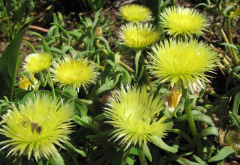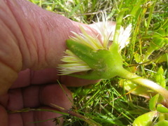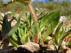 Carpanthea pomeridiana is a rapidly growing, hairy, annual, leaf succulent with a spreading, decumbent growth habit. Branches are reclining, hairy to sparsely hairy, reaching a height of 150-300 mm and with a spread of 200-300 mm. The roots are fibrous. The lower main stem grows about 5 mm in diameter, the upper stems terete, 2-3 mm in diameter. The leaves are in opposite pairs, horizontal to ascending, softly succulent, flat, united at the base, and are spoon-shaped to spear-shaped, 3.5-10 × 10-25 mm; the petiole channelled at the base, light green; the leaf margin minutely ciliate. The leaf end is acute to blunt (obtuse) to subacute.