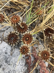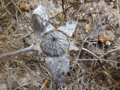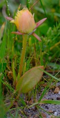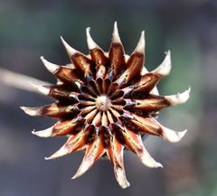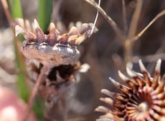 The flowers are produced terminally, 1-3 on long pedicels, 40-170 mm long; the floral bracts 20-50 × 30-70 mm. The flowers in cymes, are rich golden-yellow and about 40-70 mm in diameter. The sepals are unequal with 2 of them leafy. Petals dense, in many series, these are linear, pointed and silk-like. Stamens plentiful, at first inflexed and later becoming spreading, exposing the stigmas. The ovary is inferior, the placentas basal, 12-20 and filiform, pointed. The fruit (receptacle) is flat, bowl-shaped and 15-20 mm in diameter and 10 mm deep. When dry hygrochastical, opening with moisture, releasing the small seeds. These are roundish angular, black, 1,5 mm in diameter, the epidermis minutely papillate.